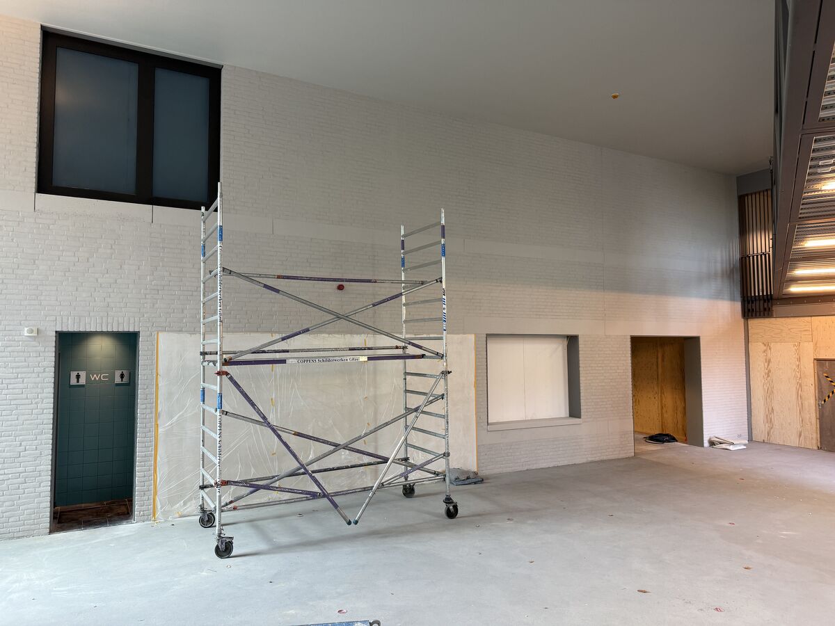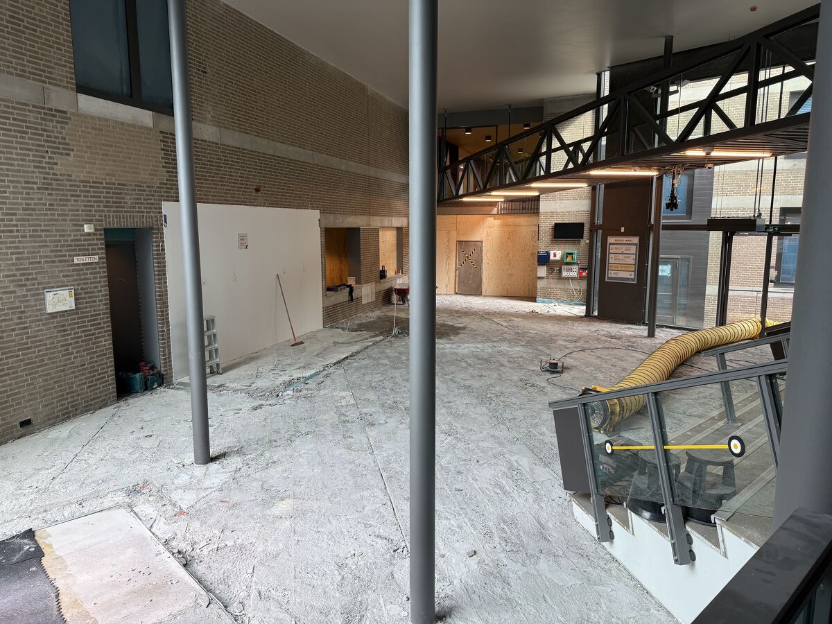 Tijdens deze fase is o.a. het bestaande tochtportaal in de hal gedemonteerd, zodat dit later in de nieuwe entree kan worden teruggeplaatst. De bestaande dekvloer is verwijderd en vervangen, installaties zijn voorbereid en de wanden van de hal zijn geschilderd.
